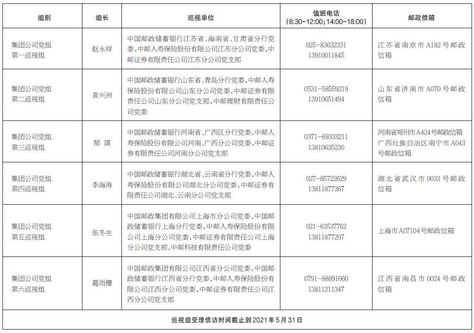 中國(guó)郵政集團(tuán)有限公司黨組2021年第一批巡視進(jìn)駐一覽表