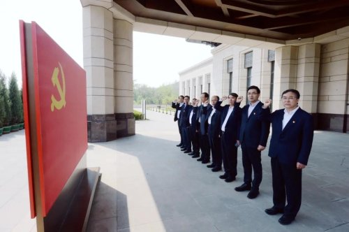 “我志愿加入中國共產(chǎn)黨,擁護(hù)黨的綱領(lǐng),遵守黨的章程,履行黨員義務(wù),執(zhí)行黨的決定……”在紀(jì)念館二層的“四梁八柱”敞軒,集團(tuán)公司黨組全體同志在黨旗前莊嚴(yán)宣誓,重溫入黨誓詞,重憶入黨初心,堅(jiān)定為黨和人民奮斗終身的理想信念。
