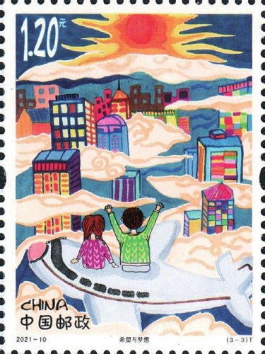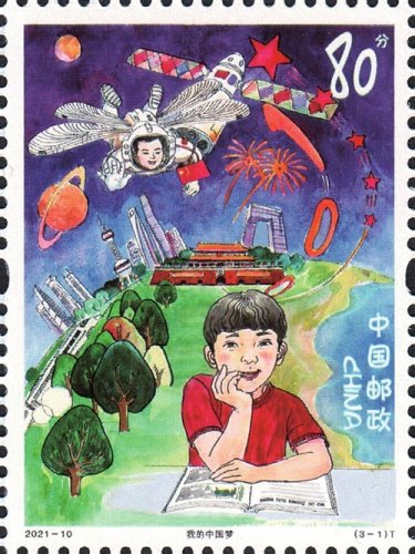 登上《兒童畫作品選》特種郵票的3幅作品“我的中國夢”“國粹之韻”和“希望與夢想”,分別由上海市同濟小學(xué)的楊曉芒、合肥新站壽春實驗中學(xué)的費玉婷、上海市周浦第三小學(xué)的錢昕逸3位小朋友設(shè)計。第一枚通過描繪我國航空航天事業(yè)、城市、交通網(wǎng)絡(luò)繁榮發(fā)展等場景,表達了少年兒童不斷追尋探索宇宙的夢想以及對未來美好生活的憧憬;第二枚描繪了傳統(tǒng)文化與城市發(fā)展、現(xiàn)代科技共繁榮的場景,表達了少年兒童對中華優(yōu)秀文化的熱愛與傳承;第三枚描繪了偉大祖國不斷發(fā)展的場景,少年兒童登高望遠(yuǎn)、憧憬未來。三枚郵票緊密圍繞主題,展現(xiàn)出少年兒童對黨領(lǐng)導(dǎo)下的偉大祖國的無比熱愛、由衷禮贊和美好祝愿。