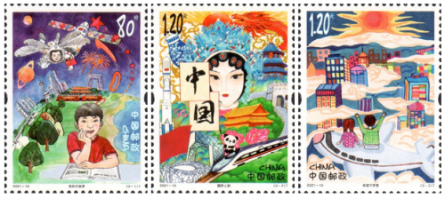 《兒童畫作品選》特種郵票一套3枚,分別為《我的中國夢》《國粹之韻》《希望與夢想》。《我的中國夢》通過描繪我國航空航天事業(yè)、城市、交通網(wǎng)絡(luò)繁榮發(fā)展等場景,表達(dá)了少年兒童不斷追尋對宇宙探索的夢想以及對未來美好生活的想象與憧憬;《國粹之韻》描繪了傳統(tǒng)文化與城市發(fā)展、現(xiàn)代科技共繁榮的場景,表達(dá)了新時代的少年兒童對中華優(yōu)秀傳統(tǒng)文化的追求和傳承;《希望與夢想》描繪了偉大祖國不斷發(fā)展的場景,少年兒童登高望遠(yuǎn)、憧憬未來。三枚郵票緊密圍繞主題,展現(xiàn)出少年兒童對黨的領(lǐng)導(dǎo)下偉大祖國的美好祝愿、熱愛和自豪。其中,《國粹之韻》由合肥新站壽春實(shí)驗(yàn)中學(xué)的費(fèi)玉婷同學(xué)設(shè)計。
