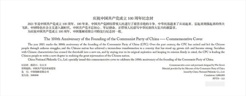 2021年6月29日,《中國共產(chǎn)黨成立100周年》紀(jì)念郵票和紀(jì)念封在中國共產(chǎn)黨歷史展覽館隆重發(fā)布。中共中央宣傳部副部長蔣建國,國家郵政局黨組書記、局長馬軍勝,中國郵政集團(tuán)有限公司黨組書記、董事長劉愛力出席發(fā)布儀式并為《中國共產(chǎn)黨成立100周年》紀(jì)念郵票揭幕,國家郵政局黨組成員、副局長戴應(yīng)軍,中國共產(chǎn)黨歷史展覽館館長吳向東,中國郵政集團(tuán)有限公司黨組成員、副總經(jīng)理康寧為《慶祝中國共產(chǎn)黨成立100周年》紀(jì)念封揭幕。中國郵政集團(tuán)有限公司黨組成員、副總經(jīng)理王儉主持。