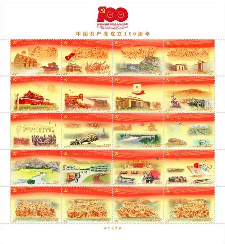按照中國共產(chǎn)黨成立100周年慶?;顒?dòng)安排,經(jīng)報(bào)請黨中央批準(zhǔn),中國郵政將于2021年7月1日發(fā)行《中國共產(chǎn)黨成立100周年》紀(jì)念郵票1套20枚,紀(jì)念封1套1枚。此次活動(dòng)發(fā)布了紀(jì)念郵票的詳細(xì)信息,內(nèi)容分別為:1.開天辟地;2.崢嶸歲月;3.中流砥柱;4.偉大勝利;5.開國大典;6.抗美援朝;7.制度奠基;8.自力更生;9.改革春潮;10.對(duì)外開放;11.世紀(jì)騰飛;12.科學(xué)發(fā)展;13.擺脫貧困;14.全面小康;15.強(qiáng)軍興軍;16.揚(yáng)帆遠(yuǎn)航;17.信仰;18.偉業(yè);19.攻堅(jiān);20.追夢。郵票采用連票設(shè)計(jì)形式,以紅色、金色為畫面主基調(diào),運(yùn)用油畫寫實(shí)手法表現(xiàn),并采用連綿不斷的飄帶貫穿整體,寓意中國共產(chǎn)黨百年奮斗的光輝歷程。該套郵票特別使用兩色紅熒光油墨,在紫光燈下,慶祝建黨百年標(biāo)識(shí)、“一大會(huì)址”、“天安門”等郵票主體元素閃放璀璨的光芒。