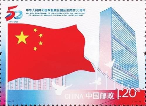 10月25日,中國郵政發(fā)行《中華人民共和國恢復聯(lián)合國合法席位50周年》紀念郵票一套1枚,全套郵票面值1.20元。郵票計劃發(fā)行數(shù)量為700萬套。