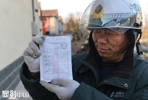 在他的這條郵路上,有5個(gè)郵政排單的蓋章點(diǎn),他每天都會認(rèn)認(rèn)真真的蓋完。圖為董乃軍在張家洞村展示已經(jīng)蓋完印章的排單。