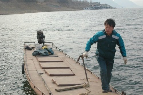 劉保朝在潘家口庫區(qū)停船靠岸。