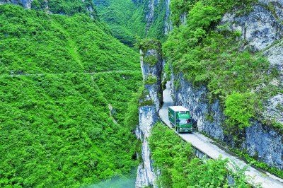 郵車(chē)行進(jìn)在大渡河大峽谷入口的懸崖絕壁之上。 新華社發(fā)