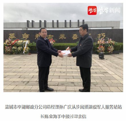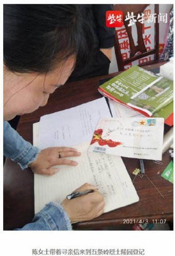 “爺爺,70多年了,我們終于找到您了!”4月3日,江蘇省鹽城市阜寧溝墩三合村陳必虎烈士的侄孫女陳女士來到五條嶺烈士陵園內(nèi)祭掃,她拿著收到的尋親信痛哭不已,她說終于圓了一家?guī)状恕?4年的尋親夢。五條嶺烈士陵園長眠著不少無名烈士,3批為烈士尋親活動(dòng)共發(fā)出765封為烈士尋親信,已通過尋親信找到331名烈士親人。