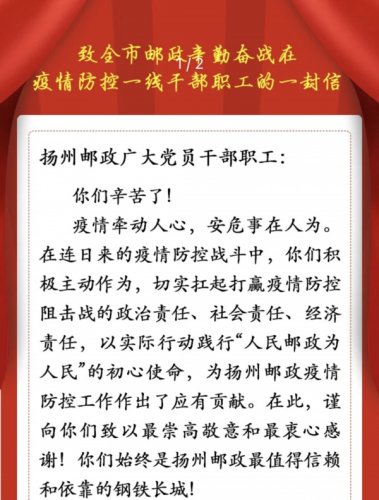 “今年以來,揚州公司克服各種不利影響,改革創(chuàng)新取得了明顯成效。面對當前揚州嚴峻復雜的疫情防控形勢,你們一手抓防疫一手抓發(fā)展,取得了很好的效果,希望你們繼續(xù)按照地方政府要求,全力做好疫情防控各項工作。堅持人民至上、生命至上,把困難估計得更充分,把形勢考慮得更嚴峻,齊心協(xié)力、攻堅克難,在保證疫情防控要求的前提下,努力彰顯中國郵政的責任擔當,堅決打贏疫情防控和經(jīng)營發(fā)展的‘雙勝利’!請向廣大揚州郵政員工轉(zhuǎn)達省分公司黨委的誠摯問候!”