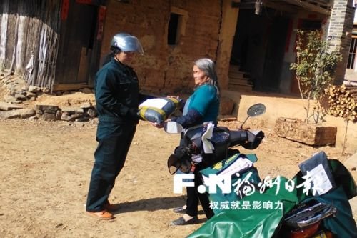 閩清縣上蓮鄉(xiāng)的高山上,一座簡陋的土墻瓦房前駛來一輛摩托車,身穿綠色工服的女郵遞員支好車,將一個(gè)包裹遞給住在這里的一位老奶奶。包裹里,是老奶奶的晚輩為她網(wǎng)購的日用品。