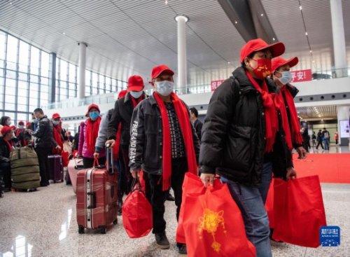 2月16日,返崗務工人員在重慶西站候車廳排隊前往檢票口,免費乘坐復工專列前往廣東省返崗務工。新華社記者 唐奕 攝