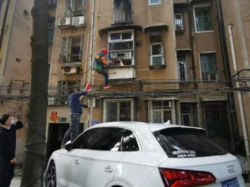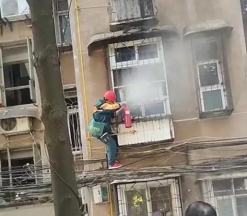 送報(bào)時(shí)偶遇起火,郵政投遞員接過社區(qū)人員的滅火器爬窗撲滅