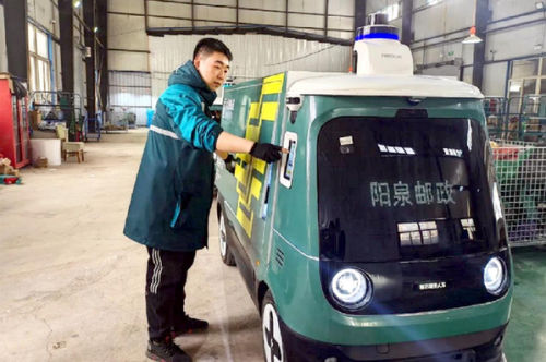 4月11日,在陽泉郵政開發(fā)區(qū)營業(yè)部分揀中心,郵政員工將快遞包裹裝進(jìn)無人物流配送車車廂內(nèi)。輕點顯示屏操作后,無人物流配送車按照系統(tǒng)預(yù)設(shè)線路自動上路行駛,并將郵件投送到指定快遞自提點。