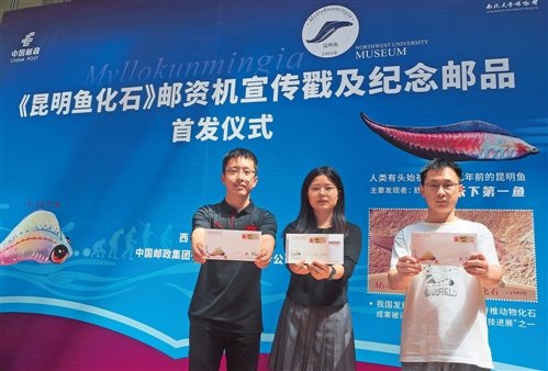 “5·18”國際博物館日當天,《昆明魚化石》郵資機宣傳戳及系列紀念郵品首發(fā)儀式在西北大學博物館舉行。此次發(fā)行的《昆明魚化石》郵資機宣傳戳及明信片、信封一套,郵資機宣傳戳以昆明魚化石及昆明魚復原圖為主圖,明信片以寒武紀早期生態(tài)復原圖為畫面進行設(shè)計,信封用手繪圖的方式展示昆明魚與“西大動物”的形象區(qū)別,并展現(xiàn)生物從魚到人的進化過程。