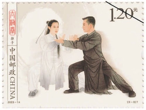 該套郵票一套3枚,圖案內(nèi)容分別為拳術(shù)、器械、推手。郵票采用工筆人物形式表現(xiàn),整體色調(diào)以黑白灰為主,背景采用水墨飛白映襯太極拳平和、包容、大道至簡的意境。第一枚郵票表現(xiàn)了一位白發(fā)長須老者,正氣定神閑地做著太極拳單鞭動作,體現(xiàn)出太極拳的傳統(tǒng)風(fēng)范和延年益壽的作用。背景用揮灑自如的水墨筆觸和肌理來表現(xiàn),伴隨老者動作產(chǎn)生無形氣韻。第二枚郵票中是一位英姿颯爽的舞劍女子,背景中如影隨形的氣流若隱若現(xiàn),體現(xiàn)出太極劍行云流水的特點(diǎn)。第三枚郵票中是一對進(jìn)行太極拳推手的男女青年,一男一女、一黑一白象征太極的陰陽相濟(jì),背后的水墨肌理隱約形成陰陽的概念,刻畫出“陰陽太極本相隨、動靜虛實(shí)把手推”的場景。