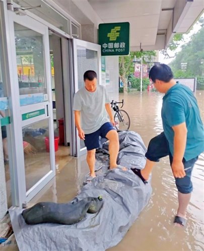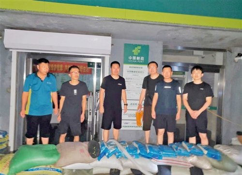 河北省涿州市郵政分公司搶險小分隊用沙袋、防水塑料布在營業(yè)廳、郵件處理中心門口圍擋防洪,開展搶險救援?!鯊堄蠲?攝影報道