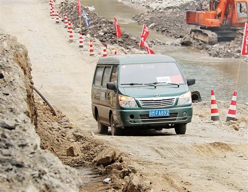 滿載救災(zāi)物資的郵車正在通過河邊臨時夯起的土路,馬不停蹄地趕往交通不便的北京市房山區(qū)蒲洼鄉(xiāng)。□本報記者 張晨昱 攝影報道