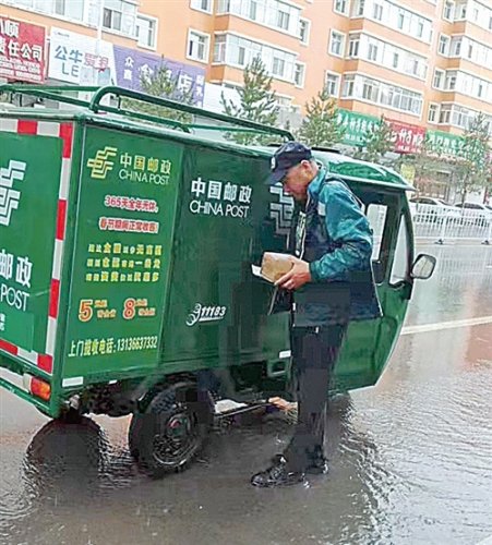 連日暴雨,路段積水,黑龍江省克東縣郵政分公司投遞員冒雨蹚水投遞。□許文佳 攝影報道