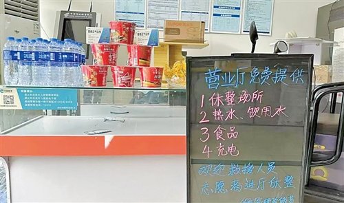 受損較輕的河北省涿州市范陽中路等郵政營業(yè)所免費向救援人員、志愿者、受災(zāi)群眾提供休憩場所和熱水、方便食品及手機充電服務(wù)?!鯊堄蠲?攝影報道