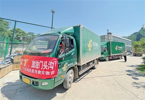 8月8日,北京市郵政分公司成立應(yīng)急運輸團(tuán)隊,為門頭溝區(qū)清水鎮(zhèn)政府運送防汛救災(zāi)物資?!跬跤钶?攝影報道