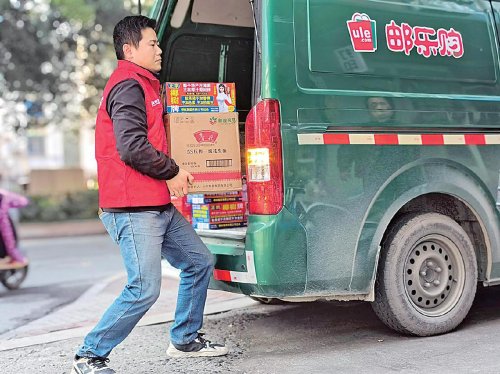 浙江省紹興市郵政分公司專職地推人員孫明在配送“年貨節(jié)”產(chǎn)品?! 踵嵥嫁薄z