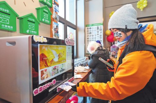 前來滑雪的游客在雪都郵局現(xiàn)場體驗打印個人專屬有聲明信片服務(wù)?!蹼 z