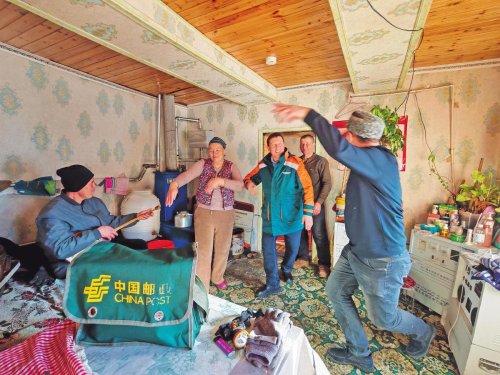 在養(yǎng)蜂戶的家中,主人熱情邀請鄉(xiāng)郵員共舞一曲。□呂文禮 攝