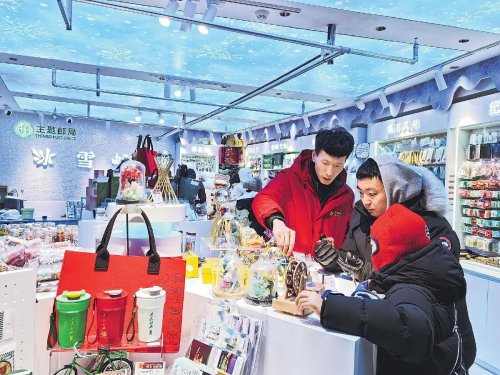 晚上10點(diǎn),游客在冰雪郵局選購(gòu)文創(chuàng)產(chǎn)品?!醢籽┚辍z