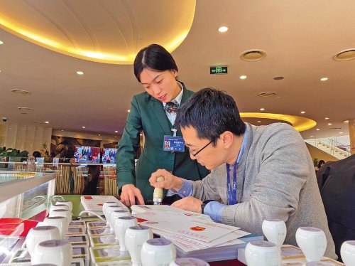 李曉爽是梅地亞中心臨時(shí)郵局的營業(yè)員。今年,梅地亞中心臨時(shí)郵局為兩會駐地新聞?dòng)浾咛峁┝朔N類豐富的郵品。李曉爽提前準(zhǔn)備,認(rèn)真了解各類郵品的特點(diǎn),力求在服務(wù)上精益求精。她說:“兩會服務(wù)讓我在政治意識、服務(wù)意識和營銷能力等方面得到了明顯提升?!薄 踔袊]政報(bào)記者 呂磊 馬佳玉 攝