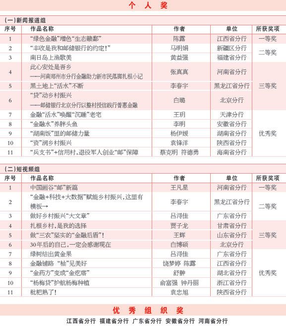 自活動啟動以來,郵儲銀行各級機構(gòu)積極響應(yīng),廣大員工踴躍參與,共收到來稿1100余篇(含短視頻)。按照公平、公正、公開的原則,評審專家評選出入圍稿件,并結(jié)合線上展播投票情況,分別評選出“新聞報道組”“短視頻組”一等獎1名、二等獎2名、三等獎3名、優(yōu)秀獎5名;根據(jù)各單位投稿、發(fā)稿和獲獎情況,評選出“優(yōu)秀組織獎”5名(見下表)。