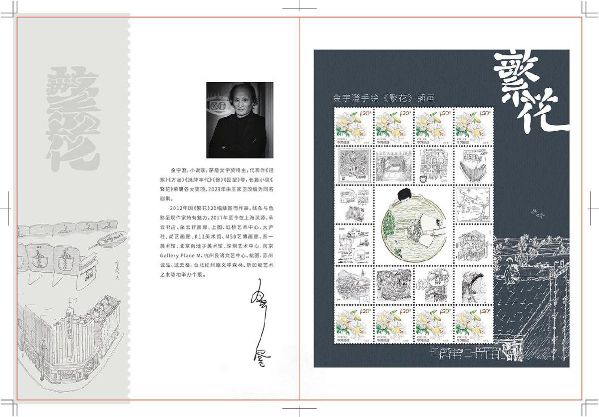 上海市分公司集郵與文化傳媒部集郵業(yè)務(wù)室項(xiàng)目負(fù)責(zé)人賈寅承擔(dān)著與金宇澄對(duì)接設(shè)計(jì)的工作。在數(shù)次的線上和線下聯(lián)系中,他感觸良多:“這次整體的溝通過(guò)程,讓我感受到了劇中經(jīng)常提到的‘不響’的處事態(tài)度?!睋?jù)賈寅回憶,金宇澄在雙方明確意向當(dāng)天,就對(duì)所有手繪插圖稿進(jìn)行整理,精心挑選出反映小說(shuō)中經(jīng)典瞬間和場(chǎng)景的13幅插畫,隔天就提供給上海市分公司進(jìn)行設(shè)計(jì)制作,這種目標(biāo)清晰、悶聲做事、執(zhí)行高效的態(tài)度讓他印象深刻。對(duì)于圖稿的細(xì)節(jié),無(wú)論是字體還是顏色,金宇澄都一一斟酌、反復(fù)推敲,“‘繁花’二字與郵票邊框處銜接應(yīng)該是截平,而不是圓筆”“房子和屋頂是個(gè)標(biāo)志,盡量露出來(lái)”“郵票上的展現(xiàn)應(yīng)該比書本更精確”……賈寅感慨道:“從這數(shù)次溝通中,我感受到了他們這代人的郵票情懷,他們是真的懂集郵。我也感受到了他們高超的文化素養(yǎng)和審美水平?!?/p>