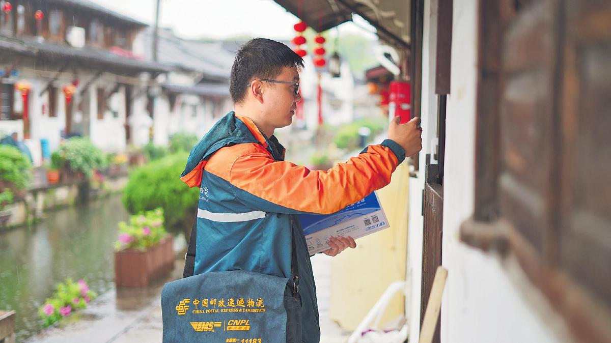 阮海良在美麗的江南水鄉(xiāng)投遞郵件。