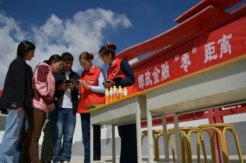 村委會中心迎風(fēng)招展的五星紅旗下,綠色的郵車即將完成郵件交接,而鮮紅的“郵政金融‘零’距離,鄉(xiāng)村振興‘郵’力量”橫幅旁,辦理業(yè)務(wù)的村民仍絡(luò)繹不絕。