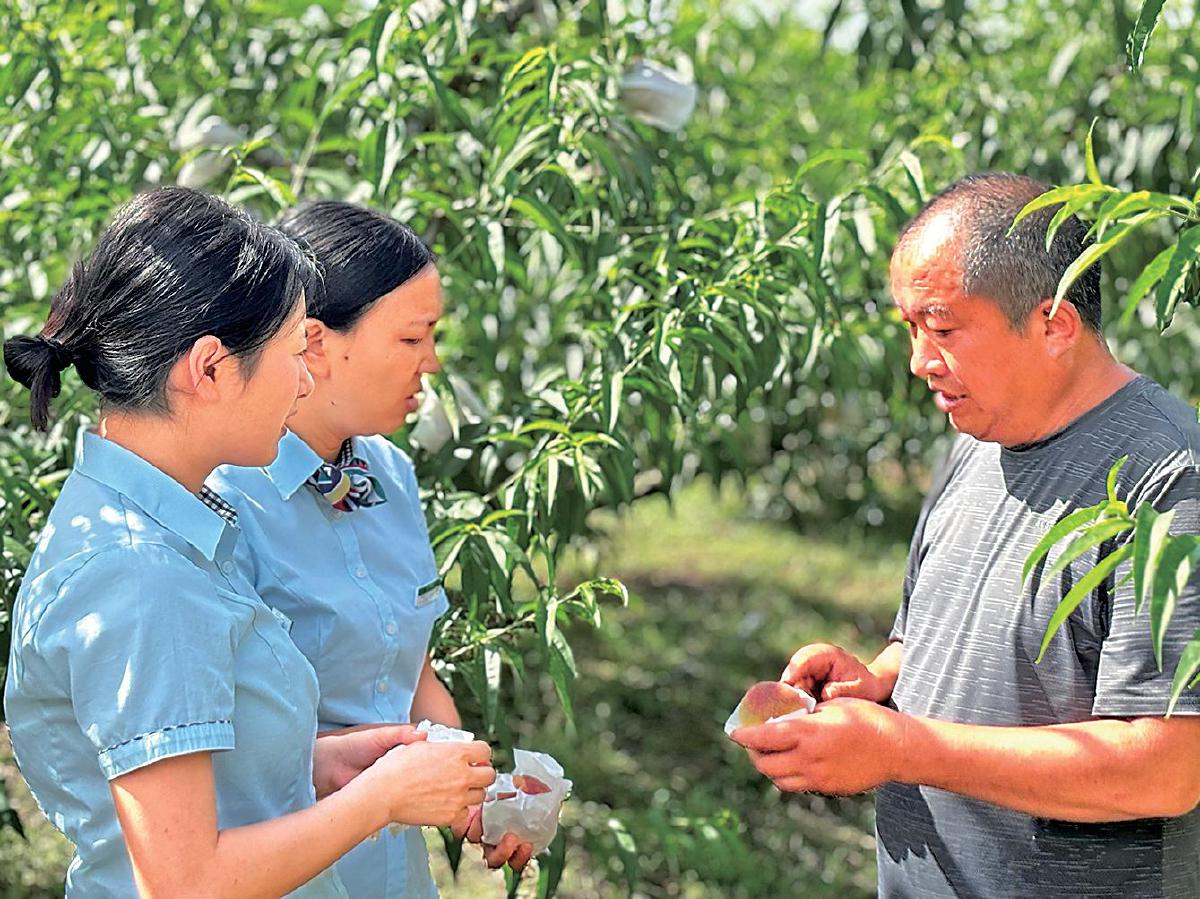 郵政工作人員在郭家村果園了解農(nóng)品情況,并向農(nóng)戶介紹郵樂平臺?! 跛呜懛f 攝