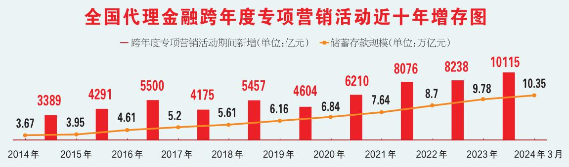 目前,全國郵政代理金融(2023—2024)跨年度專項營銷活動已圓滿結(jié)束,各級機構(gòu)內(nèi)外兼修強服務(wù)、客戶至上增價值、拓客增存增收,取得了顯著成效?;顒悠陂g,儲蓄存款新增10115億元,其中,價值存款新增10254億元,價值存款新增占比為101.4%;代發(fā)單位新增25448戶,代發(fā)金額達(dá)4072億元。截至2024年3月末,全國郵政代理金融儲蓄存款規(guī)模達(dá)103529億元??缒甓葘m棤I銷活動成為全國郵政代理金融儲蓄存款高位爬坡的“主引擎”,近10次跨年度專項營銷活動累計新增儲蓄存款59234億元,今年2月,儲蓄存款規(guī)模邁上10萬億元歷史性新臺階。