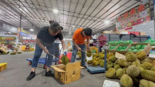 采訪完徐鈺鋒,記者跟隨潘新杰來到離郵政倉不遠(yuǎn)的水果市場,為當(dāng)日線上訂單客戶挑選榴蓮?!傲裆徱ㄟ^敲打來分辨生熟程度。偏生,就適合發(fā)較遠(yuǎn)的地區(qū);偏熟,則適合發(fā)往近的地方,這樣可以保證客戶收到水果時生熟正好。如果天氣熱,還要加冰來保證果肉新鮮。芒果如果是發(fā)到東北,我們會加裝保溫袋來避免水果凍傷。”說起不同水果的“發(fā)運經(jīng)”,潘新杰滔滔不絕。