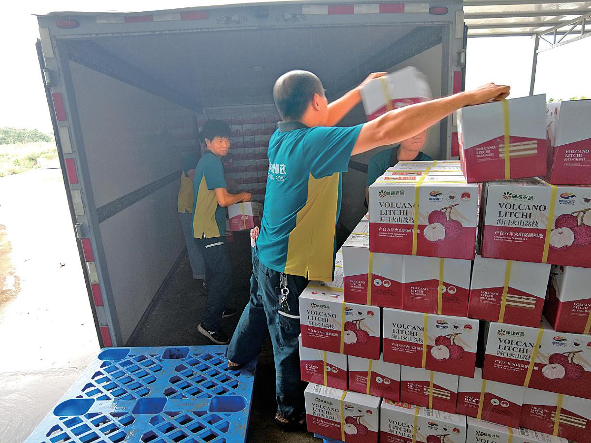 郵政工作人員正在將荔枝郵件搬運裝車?!踔袊]政報記者 黃文燕 攝