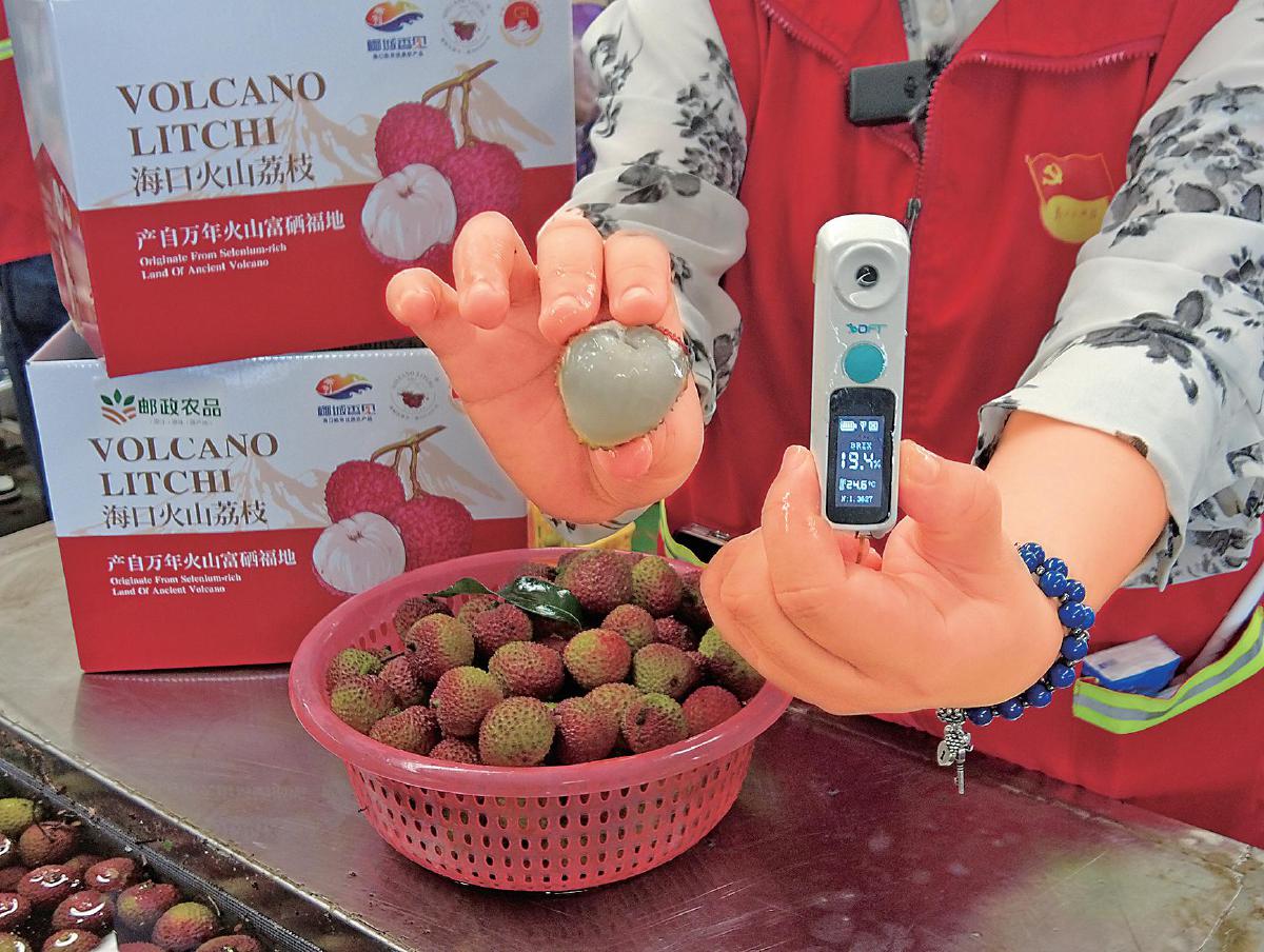 郵政工作人員測試荔枝甜度。□中國郵政報記者 黃文燕 攝