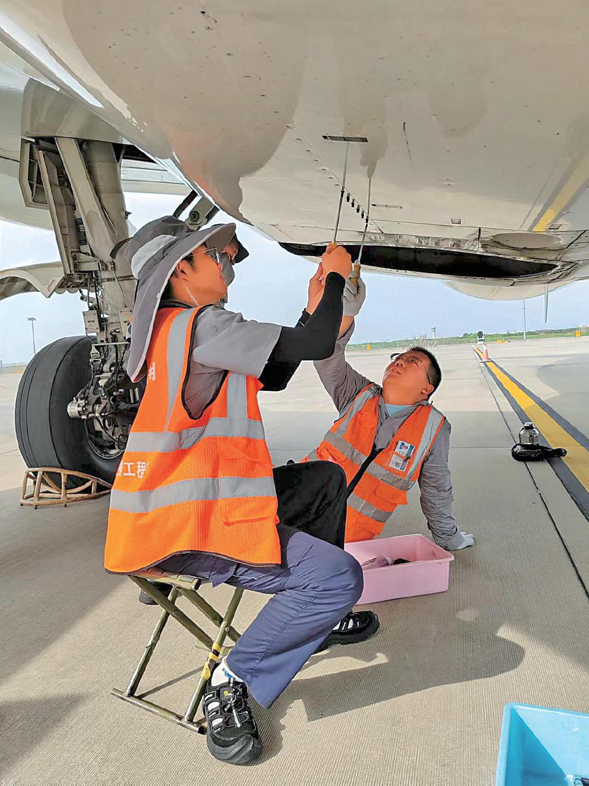 炎炎烈日,熱浪吹襲。連日來,郵航機(jī)務(wù)人員冒著高溫,堅守在停機(jī)坪上做好飛機(jī)維護(hù)工作,確保飛機(jī)安全飛行萬無一失。圖為在地表溫度超過50攝氏度的南京祿口機(jī)場郵政自主機(jī)坪,郵航機(jī)務(wù)人員在清潔飛機(jī)空調(diào)熱交換器。