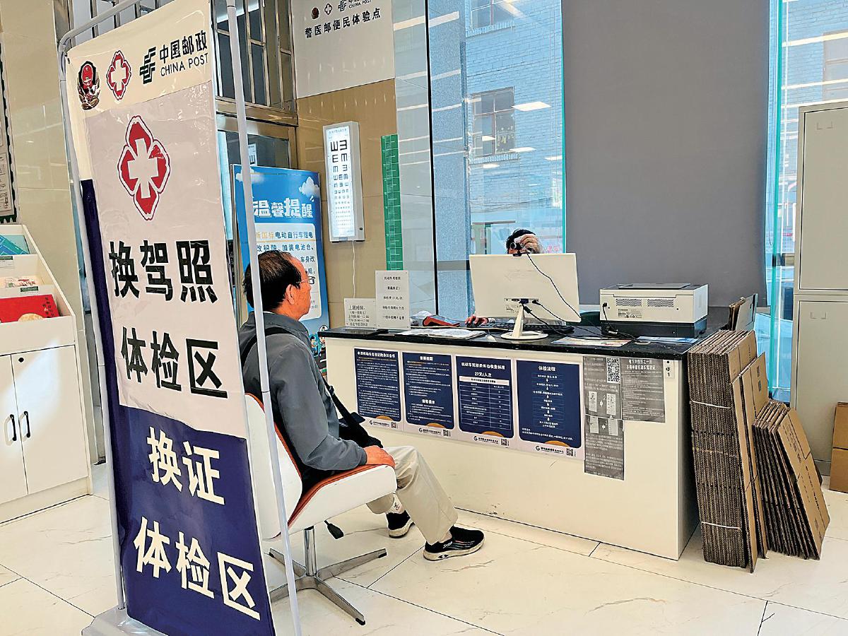 在昆明市吳井路郵政支局,工作人員為辦理機(jī)動(dòng)車(chē)駕駛證換證業(yè)務(wù)的客戶進(jìn)行體檢。