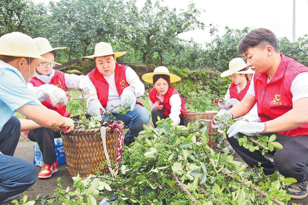 近日,重慶市江津區(qū)青花椒豐收了。江津區(qū)國(guó)際花椒產(chǎn)業(yè)城臨時(shí)開市運(yùn)營(yíng)。在距市場(chǎng)不足1公里的先鋒鎮(zhèn)雙寶村椒農(nóng)袁必蘭家的花椒地里,江津區(qū)郵政分公司一群青年員工身著紅色志愿馬甲,忙著提籃采摘花椒?;ń肪G與志愿紅的交織,共同繪就了一幅美好的豐收畫卷。袁必蘭對(duì)前來(lái)幫忙的郵政青年連聲道謝。