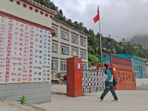 細雨連綿,道路濕滑。一路顛簸,提心吊膽,兩個小時后,郵車來到了德瑪龍村,藏式的建筑群整齊排列,五星紅旗懸掛在每戶大門上,沿街墻上張貼著“黨的光輝照邊疆 邊疆人民心向黨”等標語。