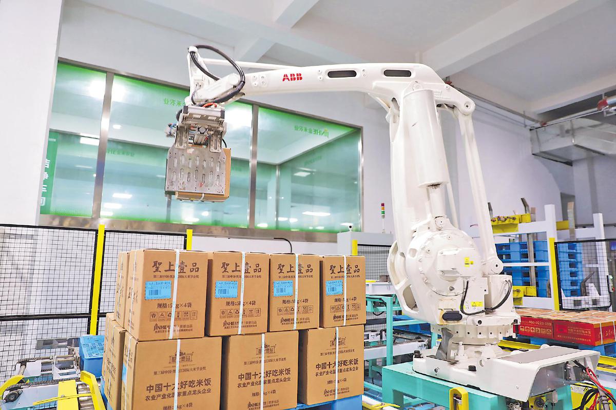 聽說郵儲(chǔ)銀行的人前來調(diào)研,本來臨時(shí)要出差的五常市金禾米業(yè)有限責(zé)任公司董事長(zhǎng)李云輝將出行時(shí)間硬是推遲1小時(shí),只為能見上一面。當(dāng)看到金禾米業(yè)生產(chǎn)線上兩臺(tái)“ABB”數(shù)控機(jī)器臂正在精準(zhǔn)分揀包裝好的盒裝高端稻米產(chǎn)品時(shí),記者不禁感嘆:“普通的大米居然能做得如此高科技!”