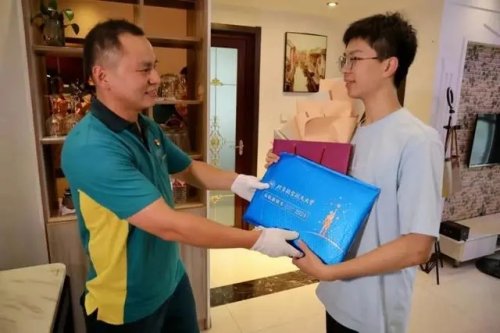 7月10日下午1點(diǎn),2024年江蘇全省首封高考錄取通知書花落常州。中國郵政常州市分公司天寧攬投部投遞員、“常州市五一勞動(dòng)獎(jiǎng)?wù)隆鲍@得者徐大磊冒雨僅用20分鐘,將北京航空航天大學(xué)的錄取通知書送達(dá)考生賈沐洋手中,并向他表示祝賀。