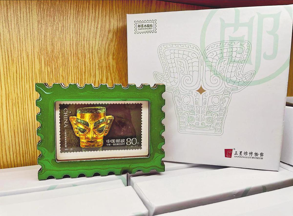 三星堆郵票冰箱貼選用了三套三星堆元素的郵票,與郵政元素相結(jié)合,邊框采用郵政綠色加郵票齒孔的設(shè)計,整體采用雙層木料加滴膠工藝使冰箱貼牢固耐用,精美的包裝也使其更易于收藏。
