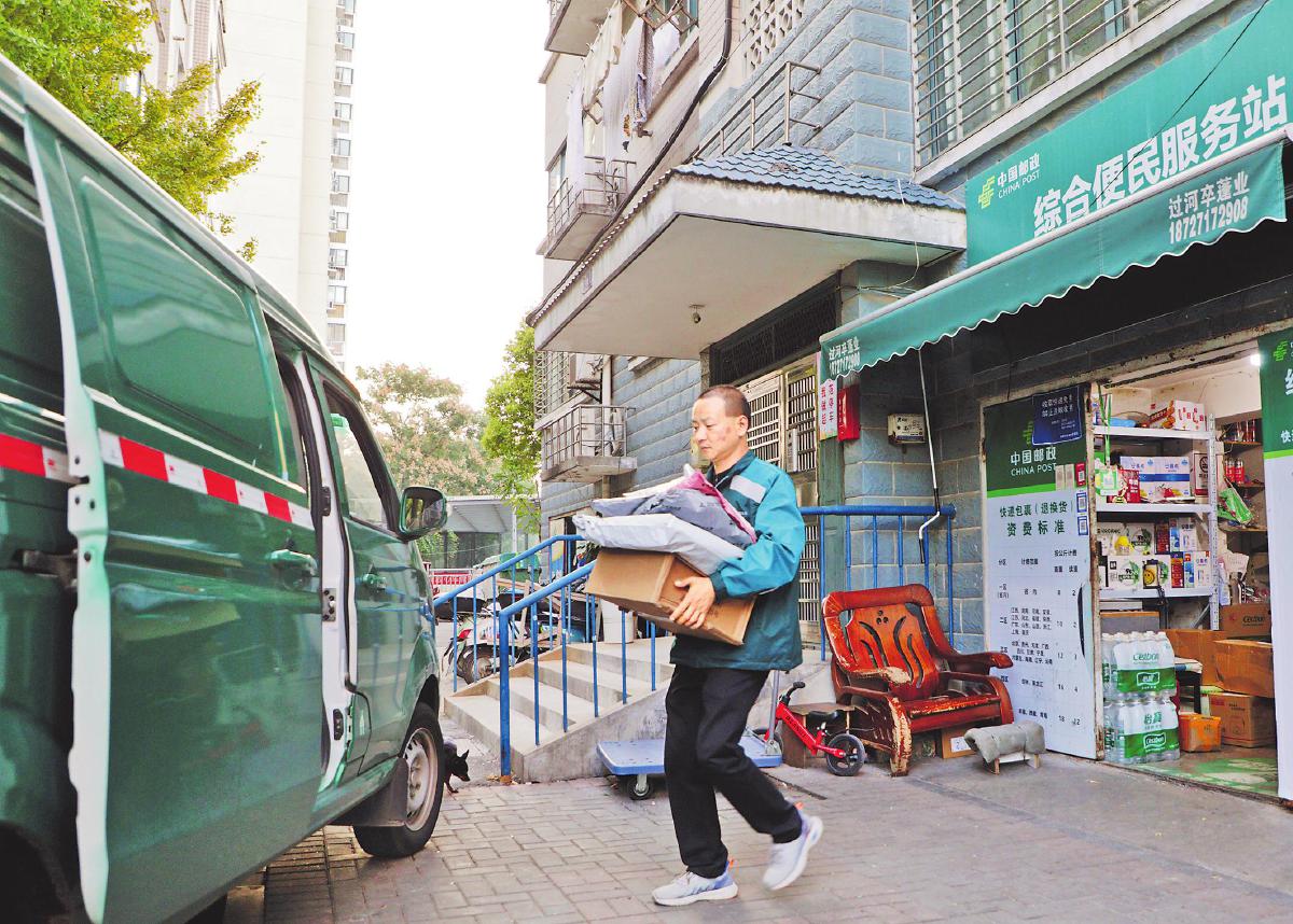 攬投員在綜合便民服務(wù)站攬收通過“寄件寶”收寄的郵件?!跛侮枴z