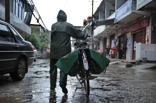 這是在江西省鉛山縣陳坊鄉(xiāng),羅細(xì)英冒著大雨騎車出發(fā)去送郵件(2011年7月19日攝)。新華社記者 周密 攝