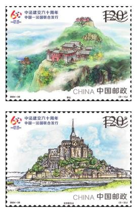 10月18日,《中法建交六十周年》(與法國聯(lián)合發(fā)行)紀(jì)念郵票發(fā)行。該套郵票一套2枚,郵票圖案名稱分別為“1.泰山”和“2.圣米歇爾山”。