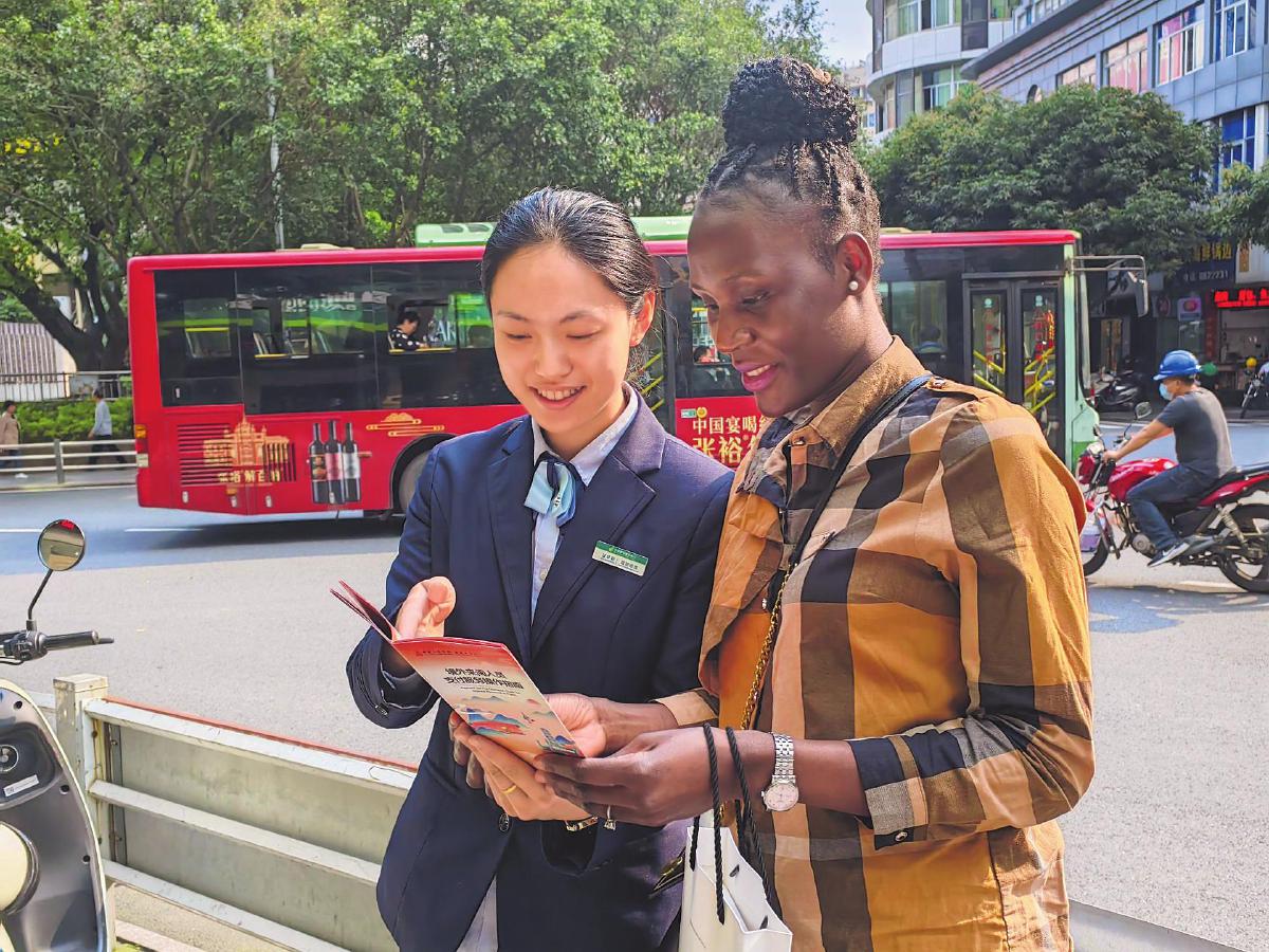 郵儲(chǔ)銀行福建省南平市分行工作人員在網(wǎng)點(diǎn)周邊向外籍客戶宣傳“零錢包”。□肖維珍攝