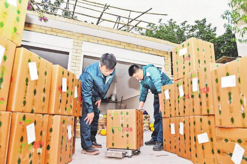 攬投員幫助果農(nóng)稱重、打單、封裝。