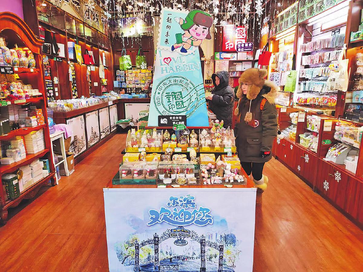 “我們是從漠河一路游玩到哈爾濱的,每到一處都要蓋上幾個紀念郵戳,買幾樣特色文創(chuàng)產品。中央大街郵局很有特色,紀念郵戳和明信片設計得都很漂亮?!币粚π∏閭H開心地展示著自己收集的各地郵戳和明信片。中央大街郵局內現(xiàn)有文創(chuàng)產品500多款,僅哈爾濱主題風光明信片就有100余種。在中央大街上能看到的糖葫蘆、馬迭爾冰棍、東北大苞米,還有哈爾濱著名的圣·索菲亞大教堂以及其他標志性景觀等,都被郵局“搬”到了屋里,成了精致可愛的文創(chuàng)產品。東北話徽章、栩栩如生的郵車模型等更是琳瑯滿目,讓許多游客久久移不開眼。
